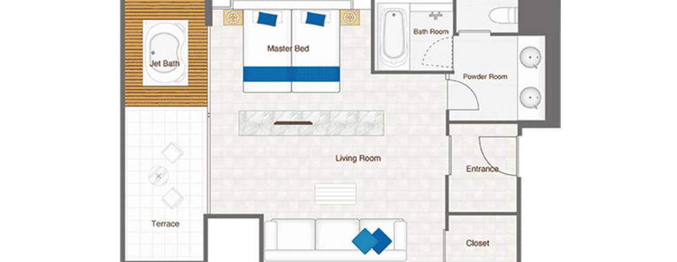 タイプ | ベッドルーム、バスルーム、パウダールーム、リビング、テラス、ジェットバス |